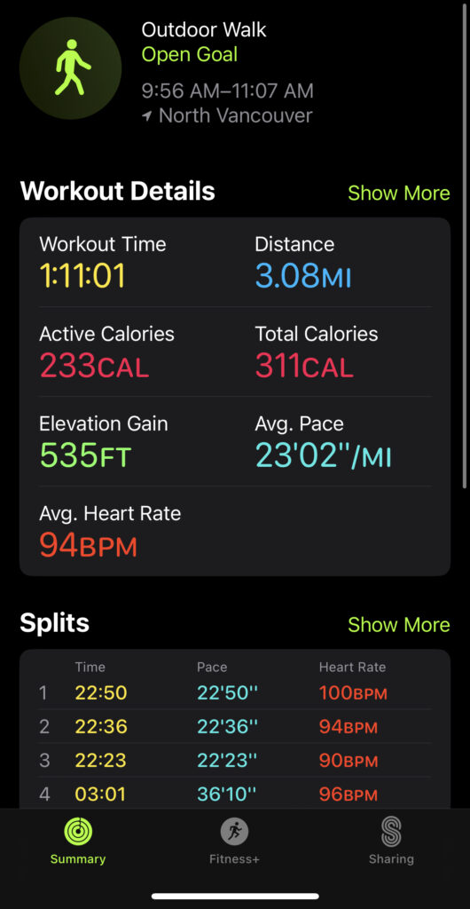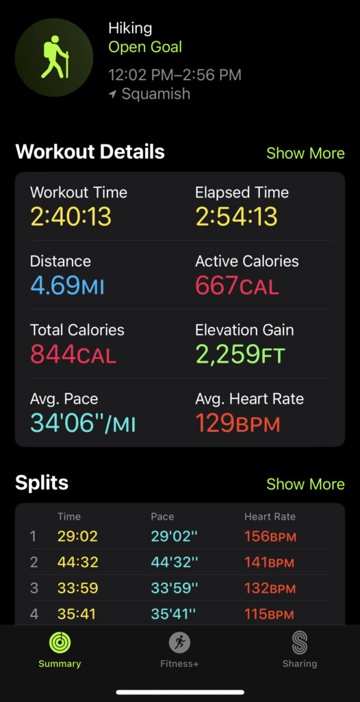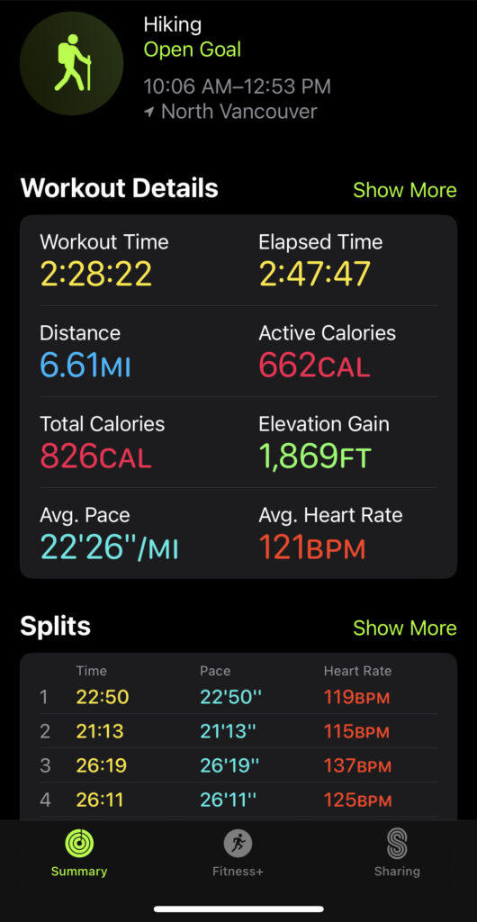 I don’t set specific goals or expectations for myself in terms of stats because I just like to enjoy myself when I hike, but I’m often pleasantly surprised by my output and achievements when I look back. It is really interesting to see how my pace and heart rate fluctuate throughout the duration of the hike. One of my favourite things to do is to compare my stats if I do the same hike multiple times. Although factors such as who you hike with, the weather, how busy it is and how tired you are will impact your success, more often than not, my stats improve when I repeat a hike. This encourages me to challenge myself and makes me excited to hike more. I often look back on my previous hikes if I’m trying to decide which hike to do on a specific day because I can look at the difficulty and the length of each hike based on my stats. This is more accurate than googling this information as the time and difficulty will vary for each person.